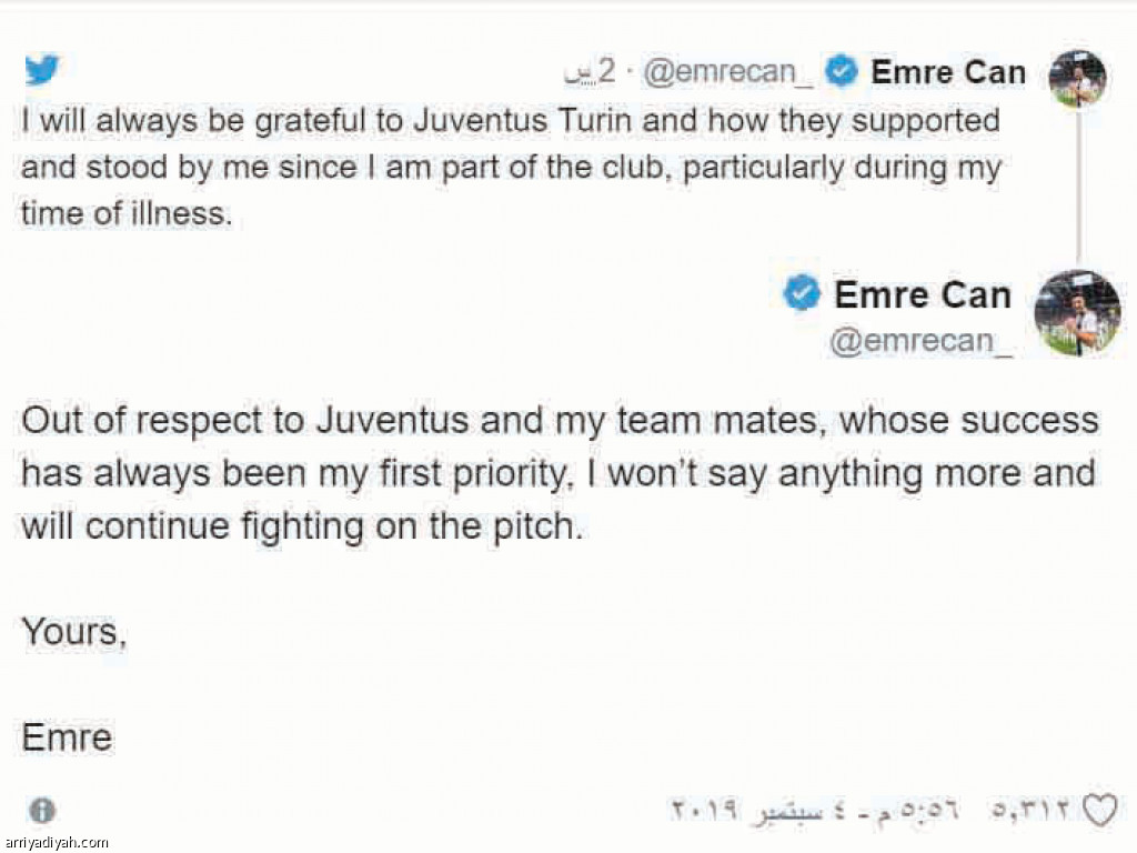 تراجع إيمري تشان، لاعب يوفنتوس، عن هجومه على إدارة النادي عقب استبعاده من قائمة الفريق في دوري أبطال أوروبا، وأكد امتنانه لإدارة ناديه.