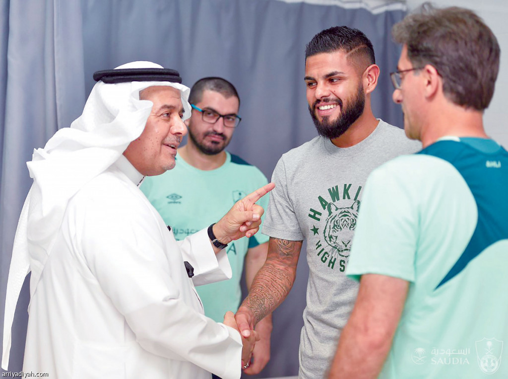 صورة التقطت أمس لمنصور بن مشعل العضو الذهبي في الأهلي والمشرف العام على كرة القدم فيه يتحدث بحضور مترجم مع البرازيلي لوكاس ليما الظهير الأيسر الجديد قبل خوض الأخير أول حصة تدريبية له مع الفريق الأول في النادي غداة وصوله إلى جدة (المركز الإعلامي ـ الأهلي)