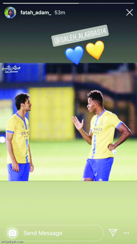 نشر عبد الفتاح آدم، مهاجم فريق النصر، وصالح آل عباس، مهاجم أبها المعار من نادي النصر، أمس عبر حسابيهما في موقع التواصل الاجتماعي "إنستجرام" الصورة نفسها التي جمعتهما في أحد تدريبات الفريق.