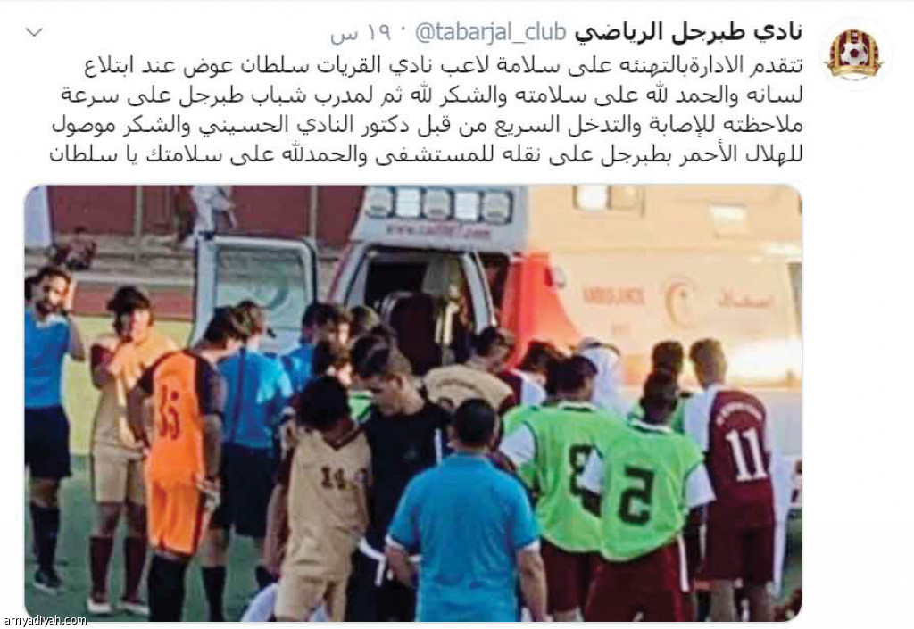 وكتب طبرجل عبر "تويتر": "تتقدم الإدارة بالتهنئة على سلامة سلطان عوض، والحمد لله على سلامته، والشكر لله ثم لمدرب شباب طبرجل على سرعة ملاحظته للإصابة والتدخل السريع".