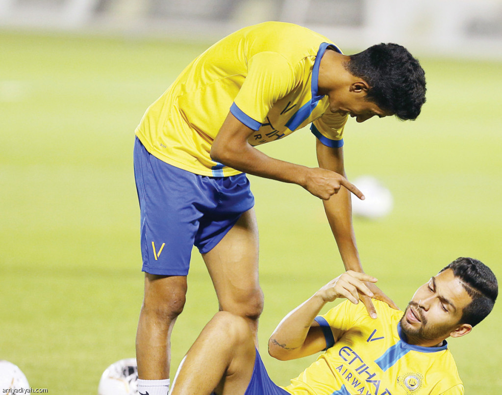 صورة التقطت أمس للبرازيلي بيتروس وفهد الجميعة ثنائي فريق النصر الأول لكرة القدم يتمازحان قبل انطلاقة التدريبات التي قادها البرتغالي فيتوريا وشهدت عودة المغربي حمد الله تصوير: عبد العزيز النومان