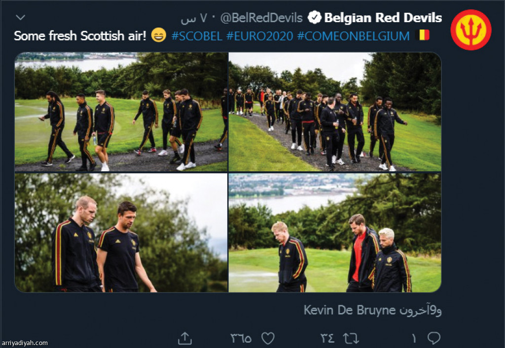 ظهر لاعبو منتخب بلجيكا الأول لكرة القدم أمس وهم يتجولون في أحد المنتجعات السياحية قبل ساعات من مواجهة نظيرهم الإسكتلندي. ونشر حساب المنتخب البلجيكي تغريدة تضمنت 4 صور وعلق عليها قائلًا (استنشقوا الهواء الإسكتلندي النقي).