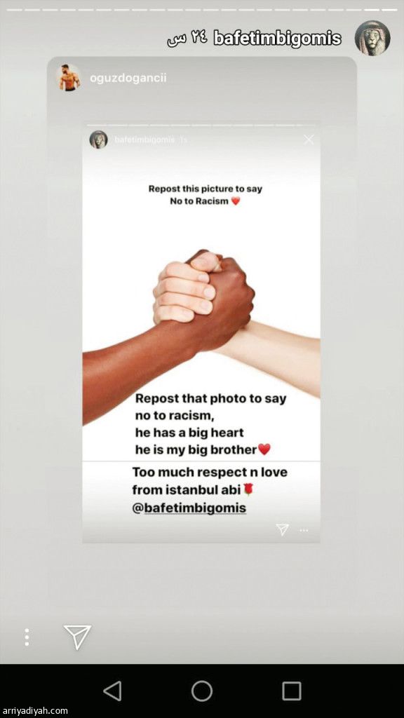 بث الفرنسي بافيتمبي جوميز، لاعب فريق الهلال الأول لكرة القدم، عبر حسابه على "إنستجرام" صورة لشخصين أبيض وأسود يسلمان على بعض، وعلّق عليها قائلًا: "لا للعنصرية".