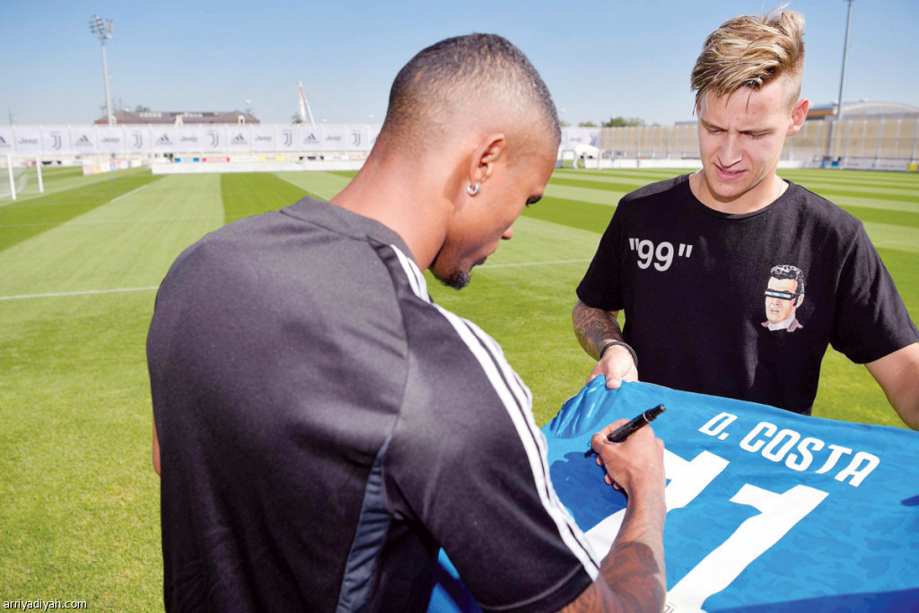 يمتاز البرازيلي دوجلاس كوستا لاعب فريق يوفنتوس الأول لكرة القدم بالسرعة ويعدُّها من أبرز عوامل نجاحه.. وفي الصورة التي التقطت أمس كوستا يوقِّع على قميصه للفرنسي فابيو كوارتارارو متسابق الدراجات النارية خلال زيارته ملعب النادي