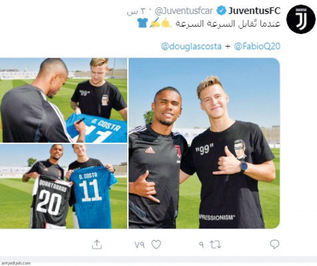 تفاعل حساب نادي يوفنتوس الإيطالي مع زيارة الفرنسي فابيو كوارتارارو، متسابق الدراجات النارية، ملعب النادي ولقائه البرازيلي دوجلاس كوستا.