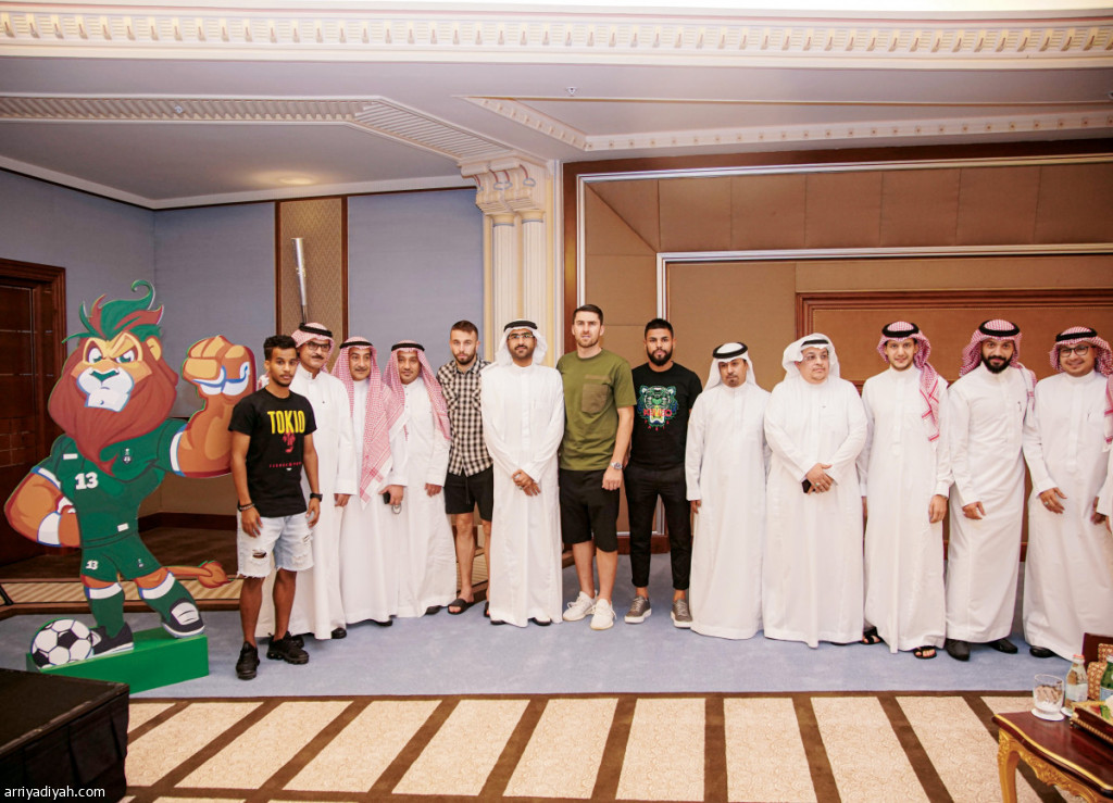 صورة التقطت أمس للمهندس أحمد الصائغ رئيس الأهلي على هامش مؤتمر توقيع العقد بين النادي وشركة "إي بوكس" في فندق ريتز كارلتون في جدة بمشاركة البرازيلي لوكاس ليما لاعب الفريق الأول لكرة القدم وزملائه عبد الرحمن غريب والبوسنيين إلفيس ساريتش وإيرفين زوكانوفيتش تصوير: عبد الله الفالح