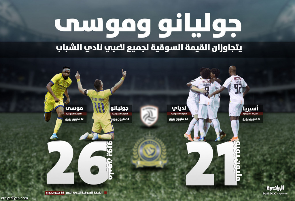 تُخبرنا أرقام موقع «ترانسفير ماركت» المختص بالقيمة السوقية للاعبين، أن قيمة لاعبي النصر تصل إلى 58 مليون يورو مقابل 21 مليون يورو تقريباً لفريق الشباب الذي جلب عدة لاعبين مؤخرا، أمثال ألفريد نداي بالإضافة إلى الأرجنتيني جوانكا.
