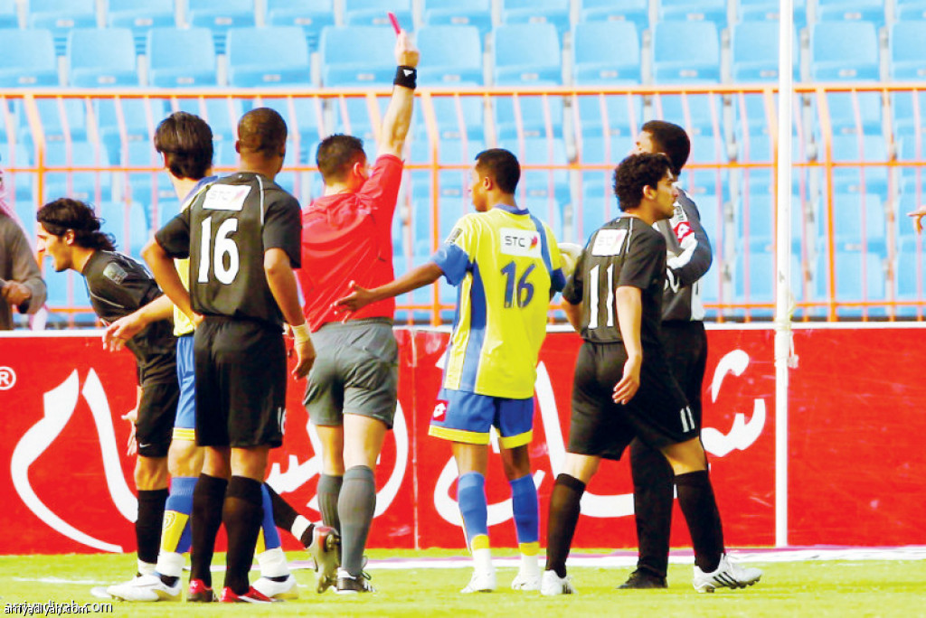 صورة التقطت لليوناني أسيليوس بامبوريديس يشهر البطاقة الحمراء في وجه خالد راضي حارس النصر خلال لقاء الشباب عام 2009 (أرشيفية)