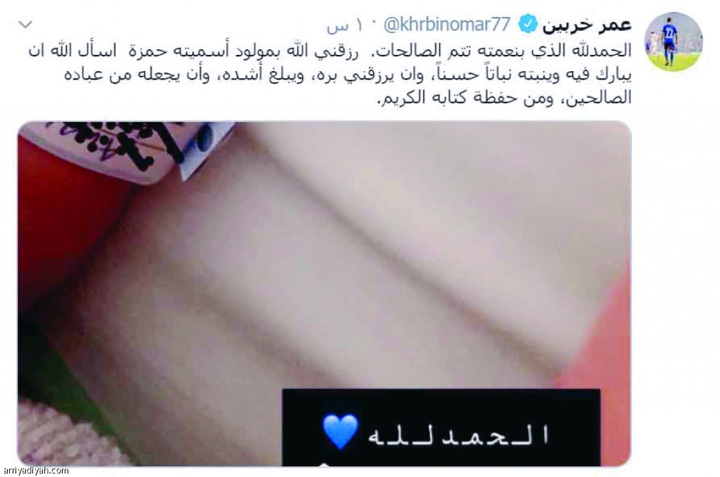 كشف السوري عمر خربين، مهاجم فريق الهلال، عبر حسابه في “تويتر” عن قدوم مولود جديد له، سمَّاه حمزة. وكتب خربين في تغريدة، أن الله عز وجل رزقه مولودًا، سمَّاه حمزة، سائلًا المولى عز وجل أن يبارك فيه وينبته نباتًا حسنًا.