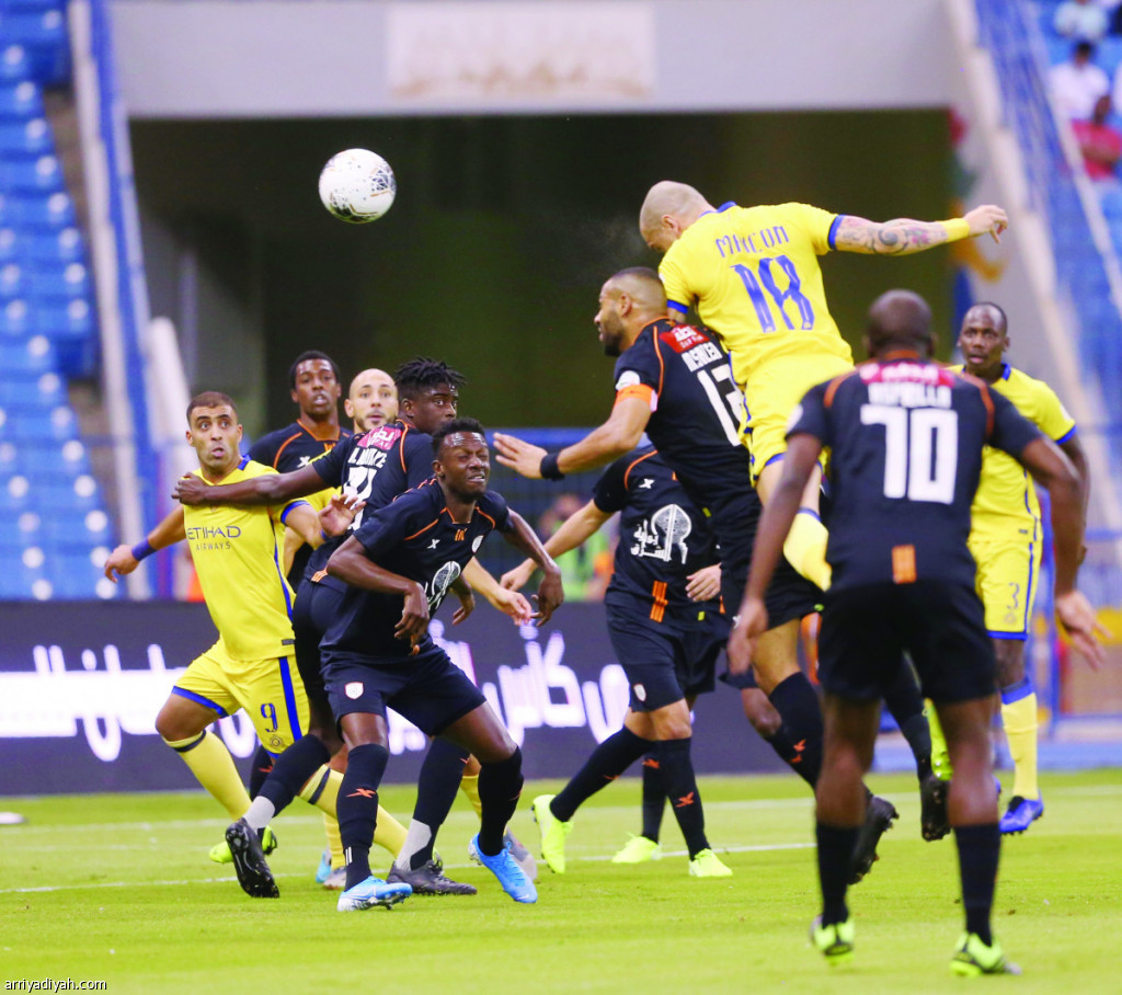 صورة التقطت أمس للبرازيلي مايكون بيريرا مدافع فريق النصر الأول لكرة القدم يصوب الكرة برأسه وسط مضايقة محمد سالم مدافع الشباب ومتابعة المغربي عبد الرزاق حمد الله مهاجم الأصفر خلال مواجهة الفريقين السلبية ضمن الجولة الثالثة من دوري كأس محمد بن سلمان للمحترفينتصوير: عبد العزيز النومان