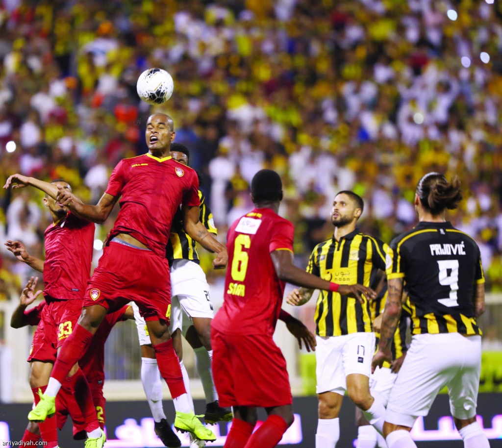 صورة التقطت أمس لالتحام هوائي داخل منطقة جزاء ضمك.. ويظهر دا كوستا مدافع الاتحاد في المتابعة بحثًا عن تسجيل هدف يعوِّض خطأهتصوير: صالح الغنام