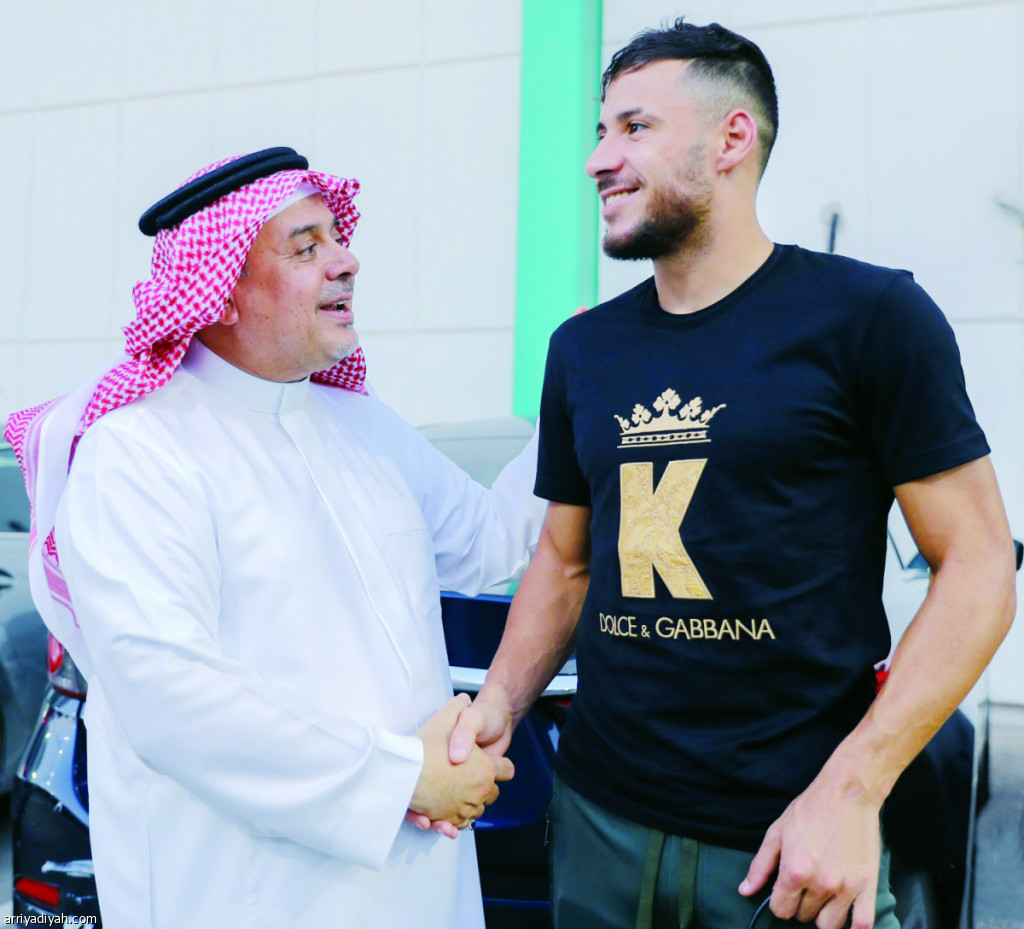 في الصورة التي التقطت أمس بلايلي يتحدث إلى منصور بن مشعل المشرف العام على فريق الكرة قبل انطلاق التدريبات (المركز الإعلامي ـ الأهلي)