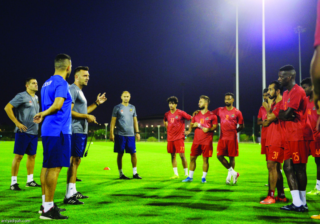 صورة التقطت أمس لماريو يتحدث إلى اللاعبين قبل انطلاق التدريبات (المركز الإعلامي ـ الوحدة)
