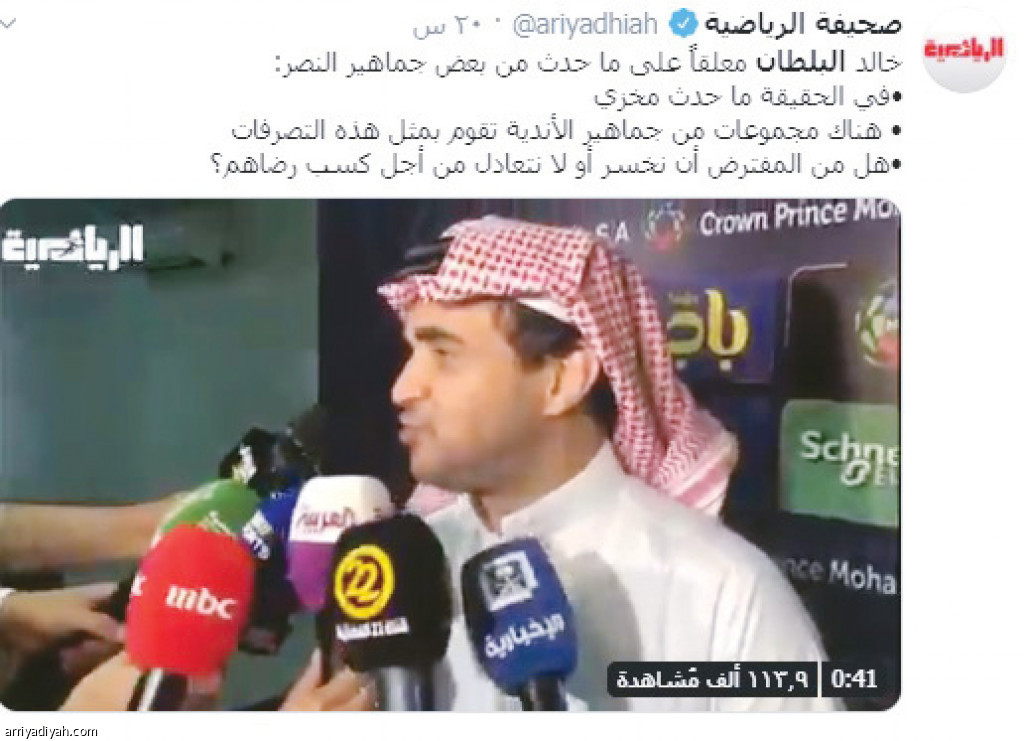 تجاوزت مقاطع الفيديو والتغريدات التي نشرها حساب "الرياضية" على موقع التواصل الاجتماعي "تويتر" لخالد البلطان رئيس الشباب عن أحداث مباراة فريقه أمام النصر المليون مشاهدة. وبلغت مشاهدات مقاطع الفيديو الأربعة التي بلغت مدتها دقيقتين وتسع ثوانٍ 350 ألف مشاهدة في أقل من 24 ساعة، فيما شاهد التغريدات 700 ألف. وحظيت التغريدات بـ936 تفضيلة، و615 رتويتًا، و1168 تعليقًا من قبل متابعي الحساب.