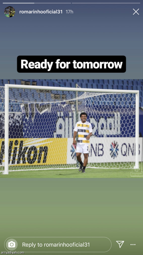 وضع البرازيلي رومارينهو مهاجم فريق الاتحاد صورة له في حسابه على موقع التواصل الاجتماعي "إنستجرام" قبل انطلاق لقاء فريقه أمام الهلال الذي جرى أمس ضمن إياب دور الـ8 من دوري أبطال آسيا. وأضاف البرازيلي تعليقًا على الصورة كاتبًا: "مستعد".