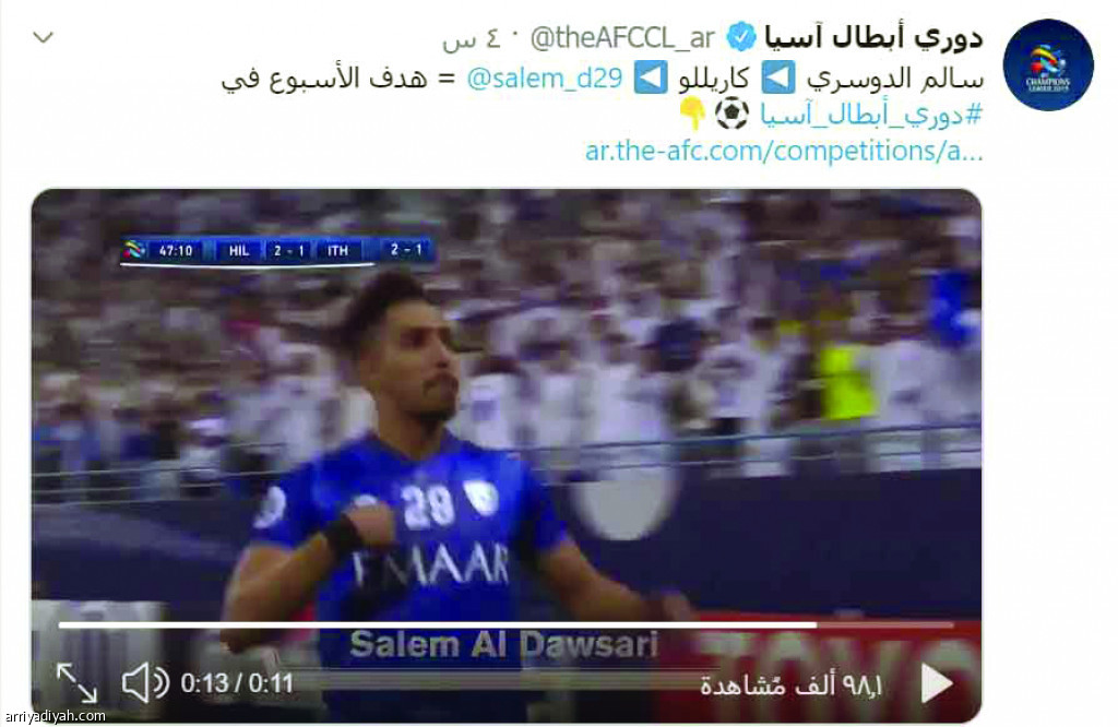 فاز سالم الدوسري، لاعب فريق الهلال الأول لكرة القدم، بجائزة أجمل هدف في إياب ربع نهائي دوري أبطال آسيا 2019، والمقدمة من شركة اليانز، وذلك بعد التصويت الذي جرى عبر الموقع الإلكتروني للاتحاد الآسيوي لكرة القدم، ونشره الموقع في تغريدة عبر حسابه على "تويتر".