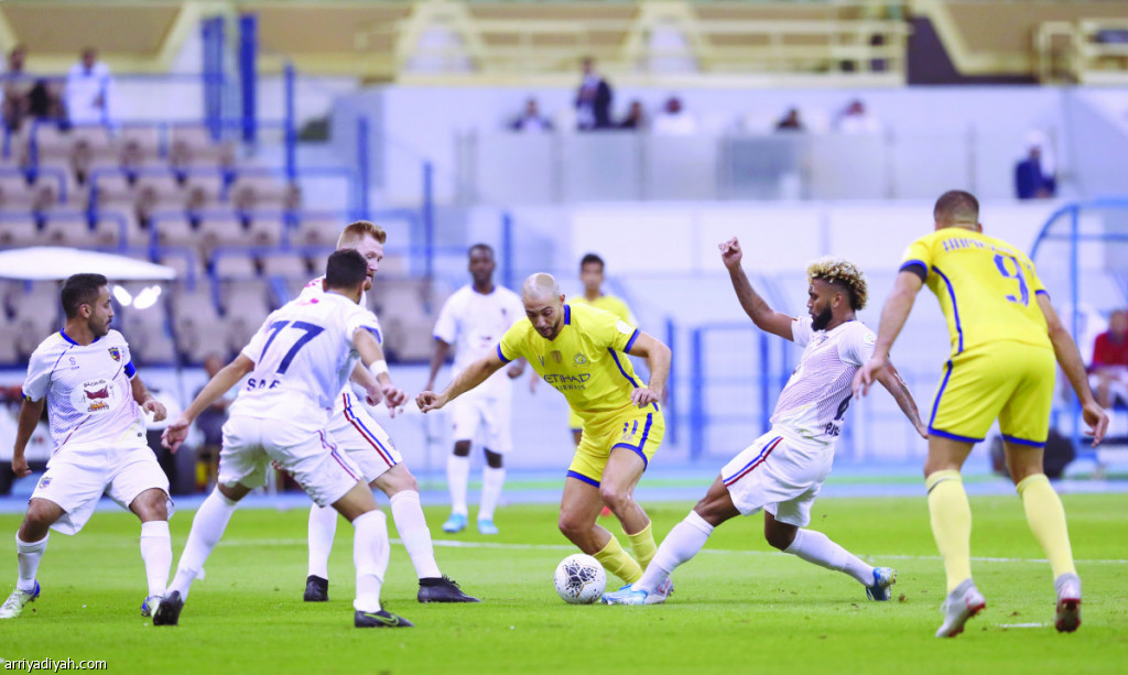 صورة التقطت أمس للمغربي أمرابط لاعب فريق النصر محاصراً بأربعة من لاعبي الحزم وحمد الله يترقب الموقفتصوير: عبد العزيز النومان