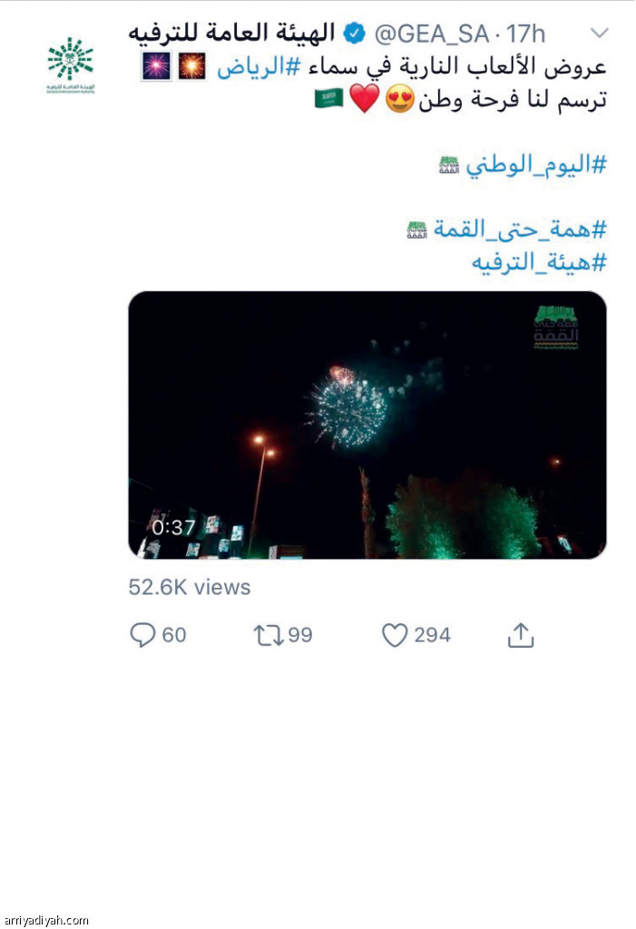 نال فيديو حساب الهيئة العامة للترفيه عبر منصة التواصل الاجتماعي “تويتر”، والذي كان محتواه عن الألعاب النارية في سماء الرياض احتفالًا باليوم الوطني السعودي، نحو 52 ألف مشاهدة وتفاعل معه أكثر من 500 حساب مستخدم في الطائر الأزرق.
