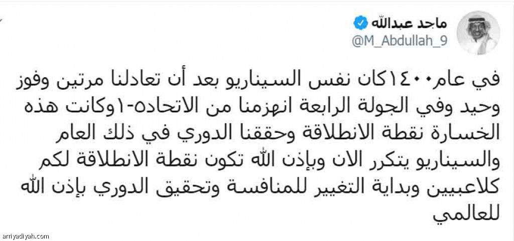 وكتب في تغريدة: "في عام 1400 كان السيناريو نفسه، بعد أن تعادلنا مرتين وفوز وحيد، وفي الجولة الرابعة انهزمنا من الاتحاد "1ـ5"، وكانت هذه الخسارة نقطة الانطلاقة، وحققنا الدوري في ذلك العام".