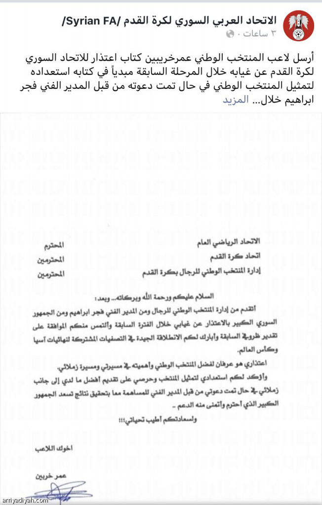 وكتب حساب الاتحاد السوري في موقع التواصل الاجتماعي "فيسبوك": "أرسل لاعب المنتخب الوطني عمر خربين كتاب اعتذار للاتحاد السوري لكرة القدم عن غيابه خلال المرحلة السابقة، مُبديًا في كتابه استعداده لتمثيل المنتخب الوطني في حال تمَّت دعوته".