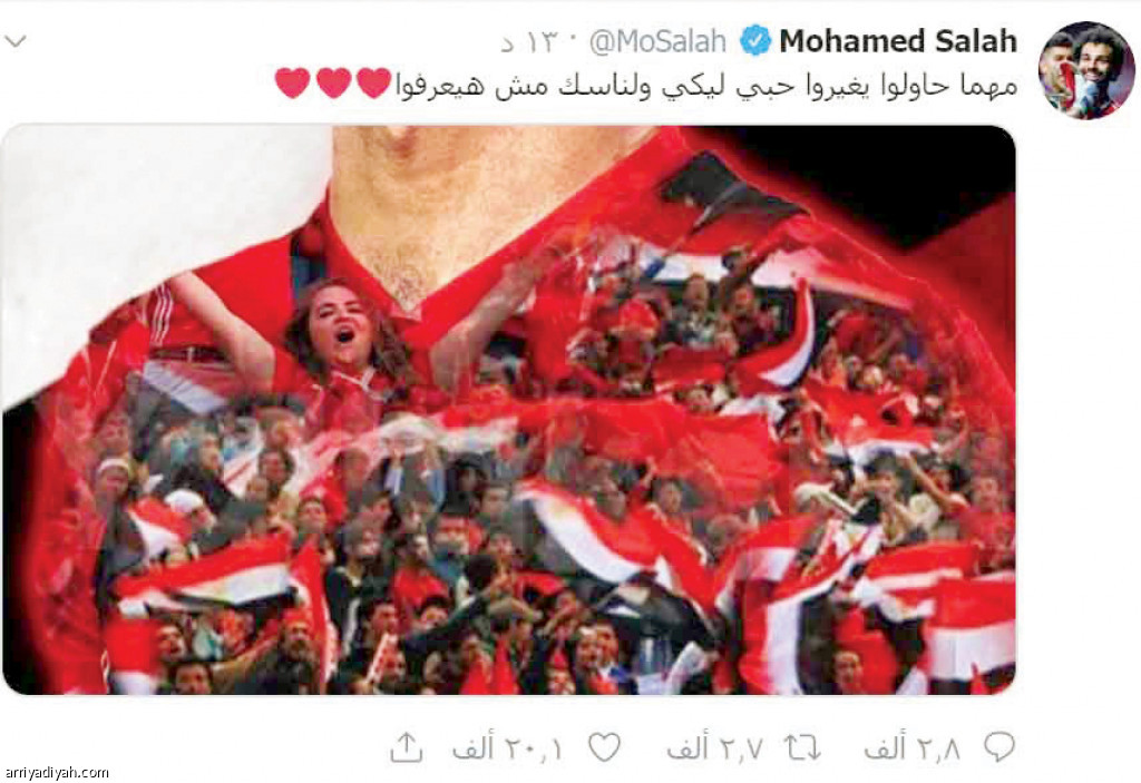 وغرَّد صلاح بصورة له، وأضاف تعليقًا كاتبًا: "مهما حاولوا يغيروا حبي ليكي ولناسك مش هيعرفوا". قاصدًا بلده مصر.