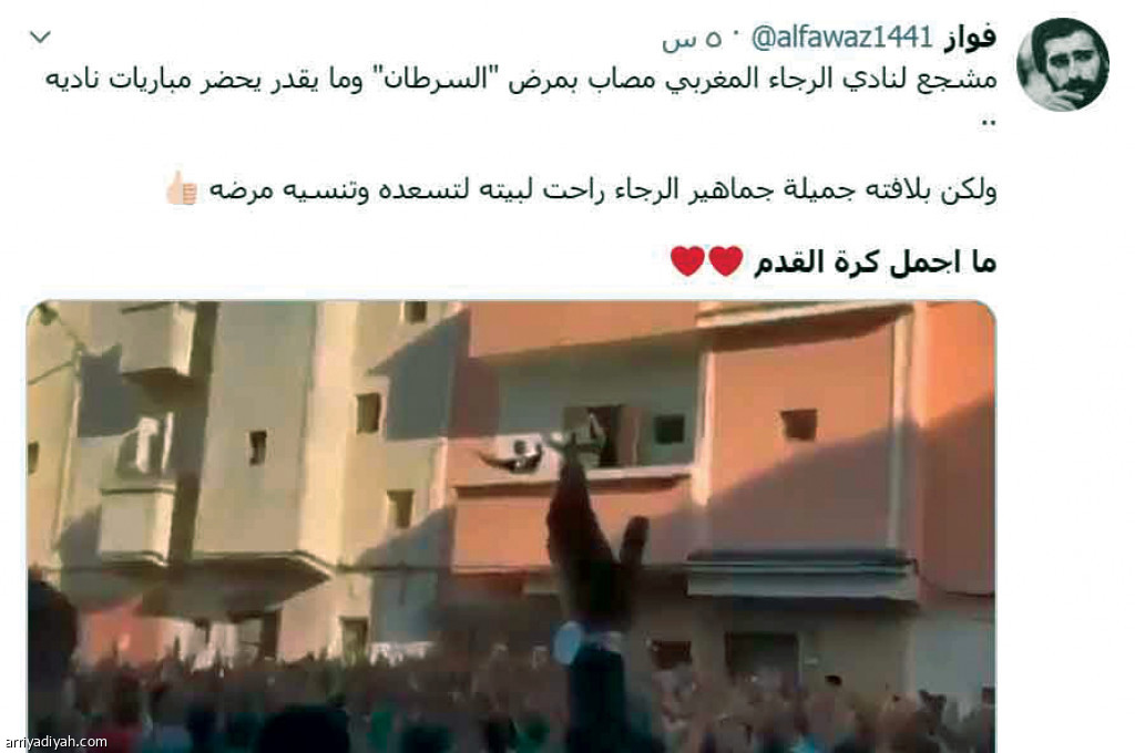 حصلت تغريدة في موقع التواصل الاجتماعي "تويتر" حوت تعليقاً كُتب فيه ما أجمل كرة القدم، على الأكثر حصولاً لعمليات التفاعل من بين التعليقات التي نالها مقطع فيديو ظهر فيه تجمع مشجعي الرجاء البيضاوي المغربي أمام منزل زميلهم المصاب بمرض السرطان والذي لا يستطيع حضور مباريات ناديه، وأثار تعاطف الكثيرين.