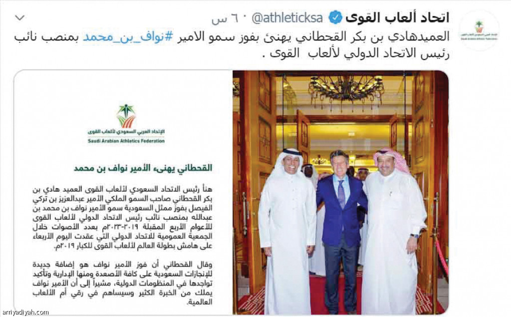 وقال القحطاني خلال بيان رسمي عبر حساب اتحاد ألعاب القوى الرسمي على "تويتر": "فوز الأمير نواف بن محمد هو إضافة جديدة للإنجازات السعودية على جميع الأصعدة، منها الإدارية وتأكيد وجودها في المنظومات الدولية".