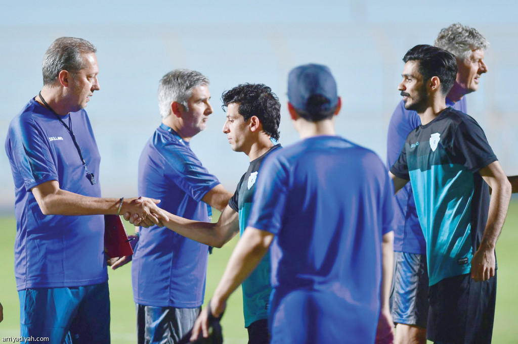 صورة التقطت أمس لجاريدو يصافح اللاعبين قبل إشرافه على التدريب الأول لفريق الباطن (المركز الإعلامي ـ الباطن)