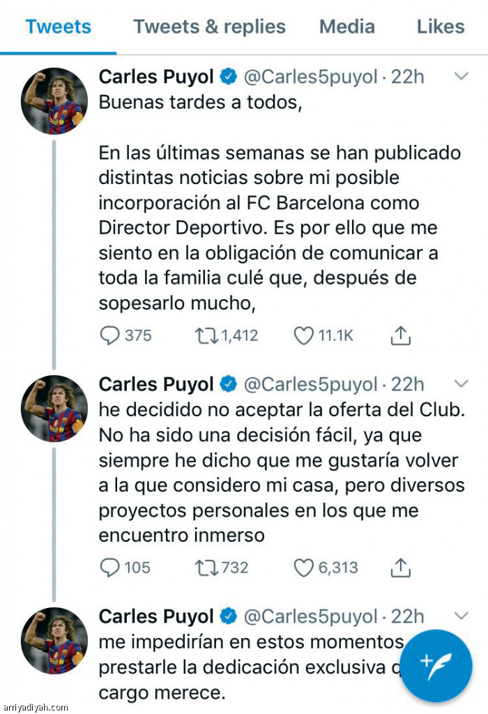 رفض كارلوس بويول قائد فريق برشلونة ومنتخب إسبانيا السابق لكرة القدم عبر صفحته على منصة التواصل الاجتماعي "تويتر" "بعد دراسة الأمر جيدا، قررت عدم قبول عرض النادي".