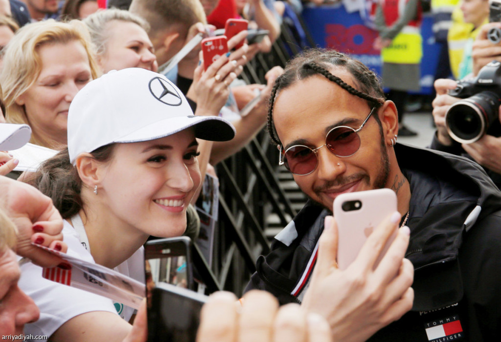 صورة التقطت أمس للبريطاني لويس هاميلتون سائق فريق مرسيدس يستجيب لطلب إحدى المعجبات أخذ "سيلفي" معه في حلبة "سوتشي أوتودروم" قبل انطلاق سباق الجائزة الكبرى الروسي لـ "فورمولا 1"