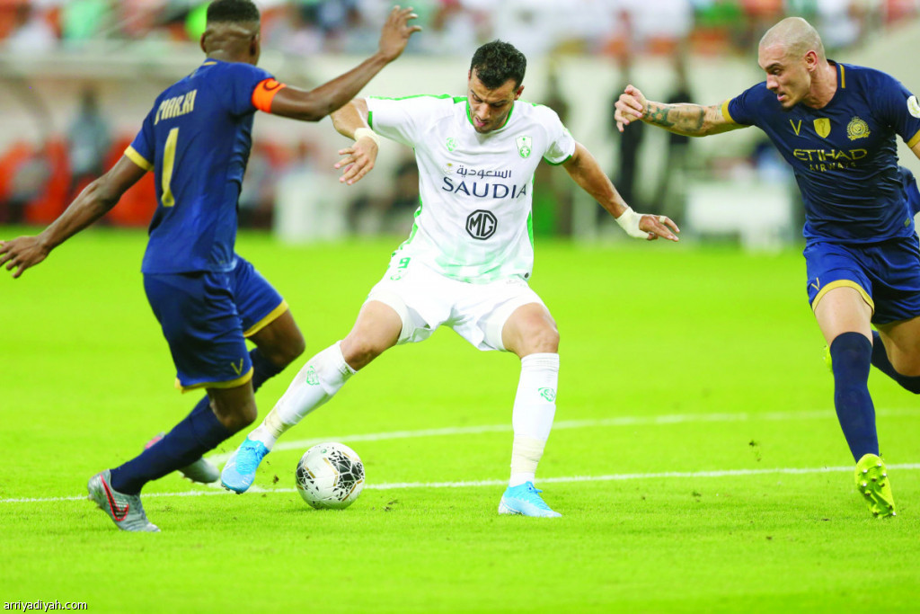 صورة التقطت أمس للسوري عمر السومة مهاجم فريق الأهلي محاصراً بالثنائي مايكون وعمر هوساوي لاعبي النصر تصوير: على خمج