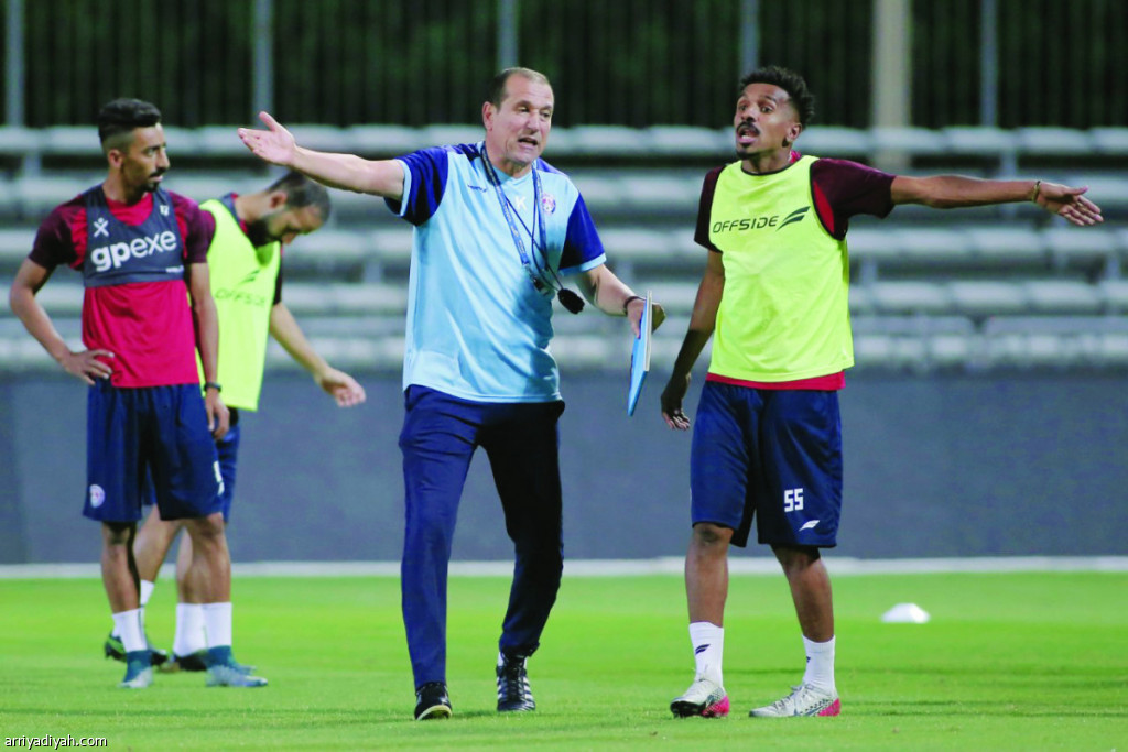 صورة التقطت أمس لإسكندر القصري مدرب العدالة وعبد العزيز مجرشي الظهير الأيمن يتبادلان النقاش خلال التحضيرات لمواجهة الفيصلي اليوم(المركز الإعلامي ـ العدالة)