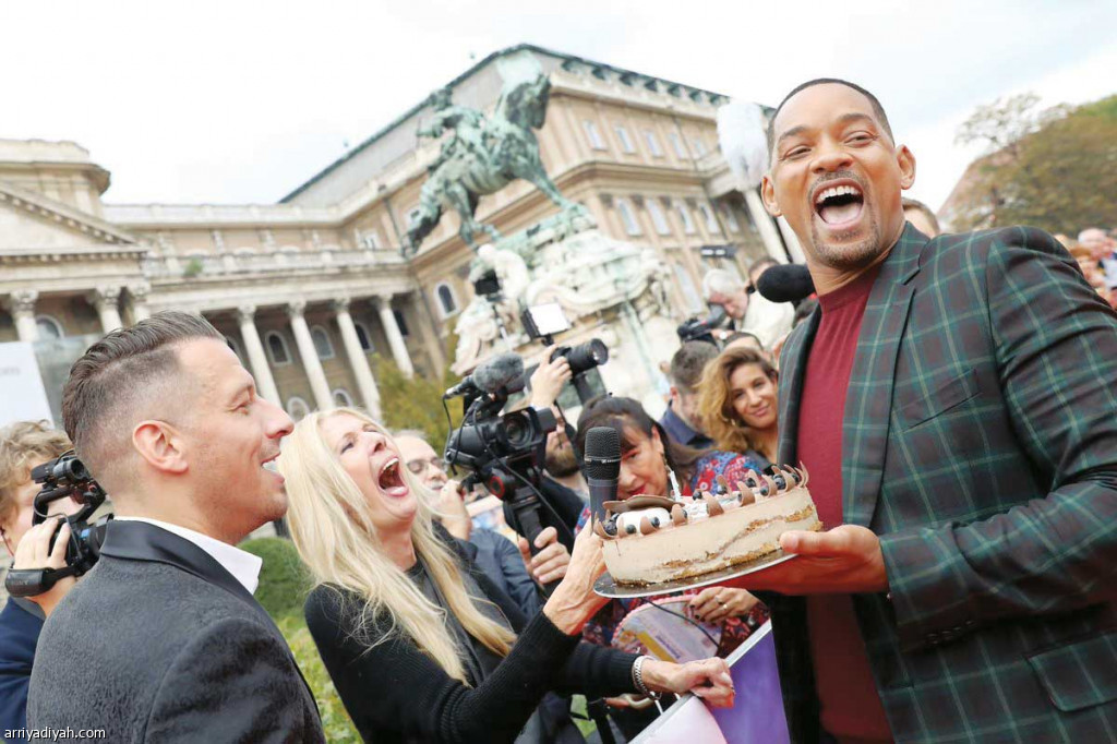 صورة التقطت لويل سميث الخميس الماضي محتفلاً بيوم ميلاده مع طاقم الفيلم والجمهور في بودابست العاصمة المجرية (المركز الإعلامي ـ جيميني مان)