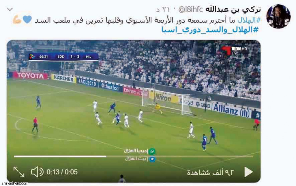 في حين حصل فيديو الهدف الرابع للهلال الذي سجله البديل محمد الشلهوب على الفيديو الأكثر تداولًا في هاشتاق #الهلالوالسددوري_آسيا الذي تصدر الترند السعودي بـ 245 ألف تغريدة، إذ ظهر فيديو هدف الشلهوب في نحو 1.103 ألف تغريدة.
