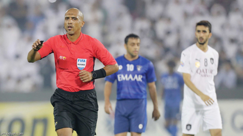 صورة التقطت أمس لأحمد الكاف الحكم العماني الذي قاد المباراة ويظهر خلفه محمد الشلهوب قائد الهلال وعلي أسد لاعب السد القطري (الفرنسية)