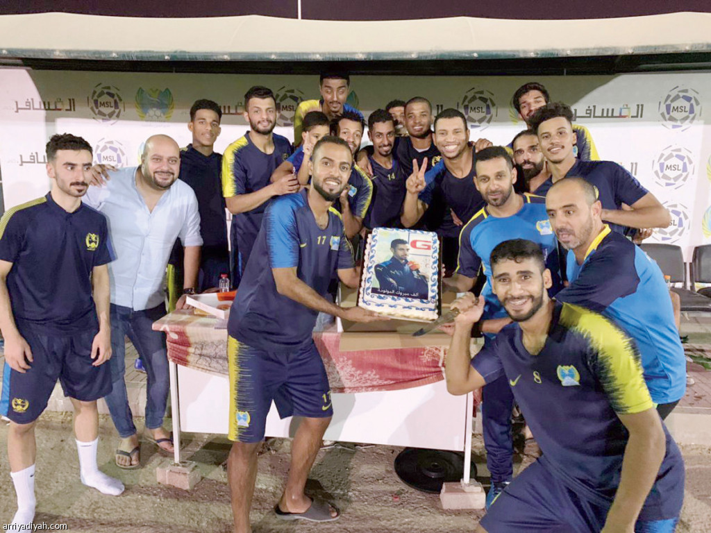 احتفل لاعبو فريق الجيل الأول لكرة القدم بالمولودة الجديدة لفهد الخميس قائد الفريق قبل بداية الحصة التدريبية.. وفي الصورة التي التقطت أمس لاعبو الجيل يحملون التورتة المعدة للمناسبة وعليها صورة الخميس (المركز الإعلامي ـ الجيل)