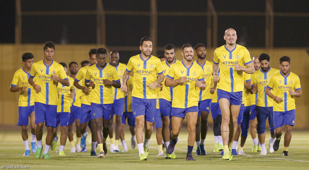 صورة التقطت أمس لمايكون والبريكان وجوليانو والمنصور وبيتروس لاعبي النصر يتقدمون زملاءهم في التدريبات تصوير: عبدالعزيز النومان