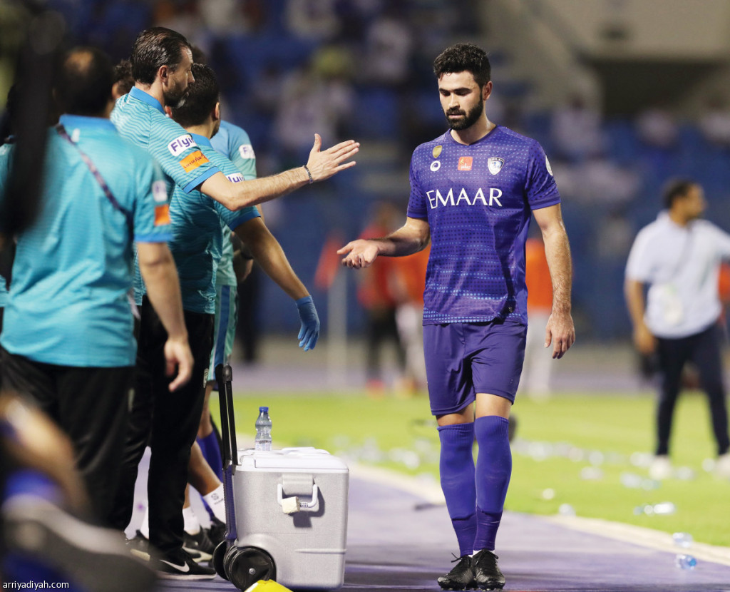 ظهرت علامات الغضب على السوري عمر خربين، مهاجم فريق الهلال الأول لكرة القدم، بعد أن قرر الروماني رازفان لوشيسكو، مدرب الفريق، استبداله عند الدقيقة 62 من زمن شوط المباراة الثاني بالفرنسي جوميزتصوير: فهد المري