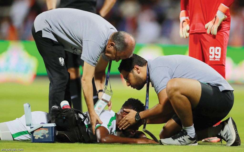 صور التقطت أمس، المصري بربري أخصائي العلاج والتونسي حاتم جمعة طبيب الفريق يسعفان اللاعب في الميدان عقب الإصابة، وفي الثالثة دجانيني يجلس بين زملائه بعد استبداله تصوير: سعد العنزي