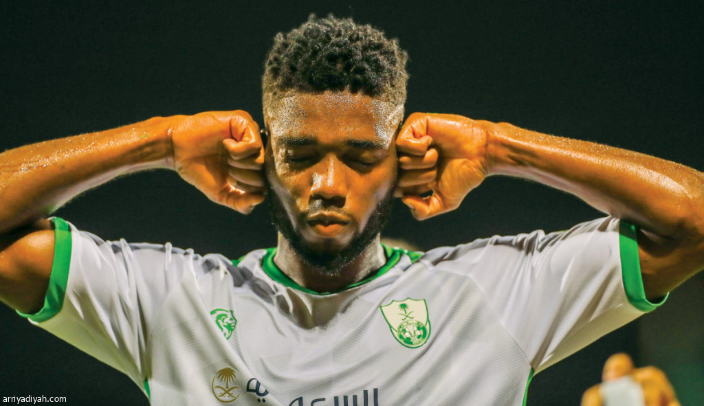 صورة التقطت أمس للرأس الأخضري دجانيني تفاريس لاعب الأهلي بعد تسجيله الهدف الأول لفريقه في مرمى الفيحاء تصوير: عيسى الدبيسي وعبد الرحمن السالم وفهد الضويفري و(المركز الإعلامي ـ الأهلي)