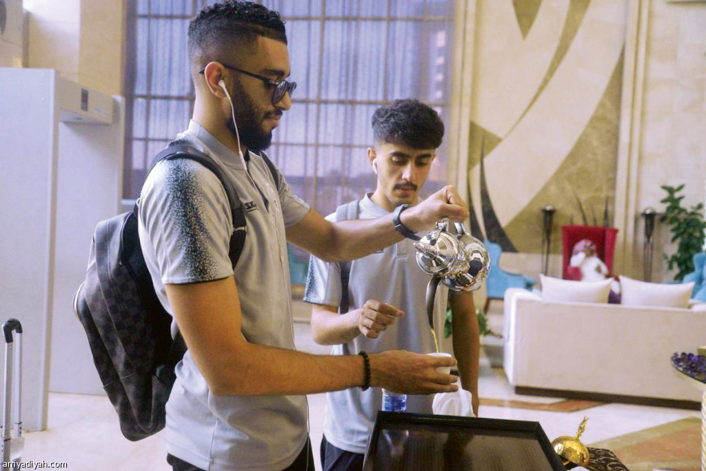 صورة التقطت أمس للثنائي مجاهد المنيع وعادل الذويب لاعبي فريق الطائي الأول لكرة القدم يتناولان القهوة العربية لحظة وصول البعثة إلى مطار الملك فهد الدولي في الدمام استعداداً للقاء الثقبة اليوم في الجولة الثامنة من دوري الأمير محمد بن سلمان لأندية الدرجة الأولى (المركز الإعلامي ـ الطائي)