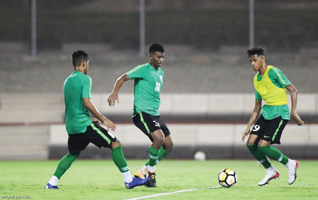 صورة التقطت أمس للثلاثي محمد مران وحمزة كعبي وحسن العلي لاعبي المنتخب السعودي لكرة القدم تحت 19 عامًا أثناء التدريبات قبل مواجهة الأردن اليوم في جدة (المركز الإعلامي ـ المنتخب السعودي)