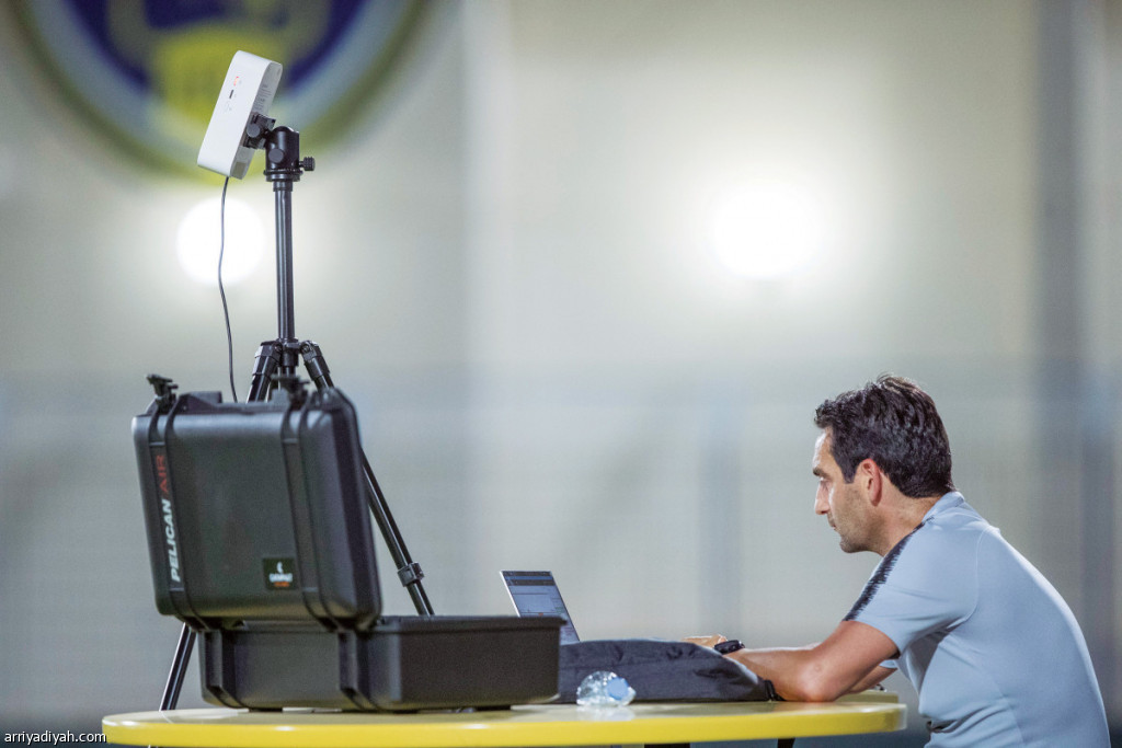 صورة التقطت أمس للفرنسي ديفيد دوسي مساعد المنتخب السعودي الأول لكرة القدم يراقب القياسات الخاصة باللاعبين تصوير: فهد الضويفري