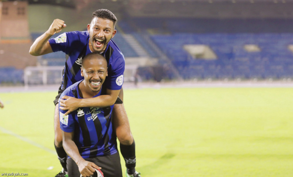 صورة التقطت أمس ليحيى عتين لاعب فريق النهضة الأول لكرة القدم يحمل نواف الشويعر على ظهره ويعبران عن فرحتهما بعد نهاية المباراة وتحقيق الفوز على الكوكب بهدفين مقابل هدف في الدمام تصوير: عيسى الدبيسي