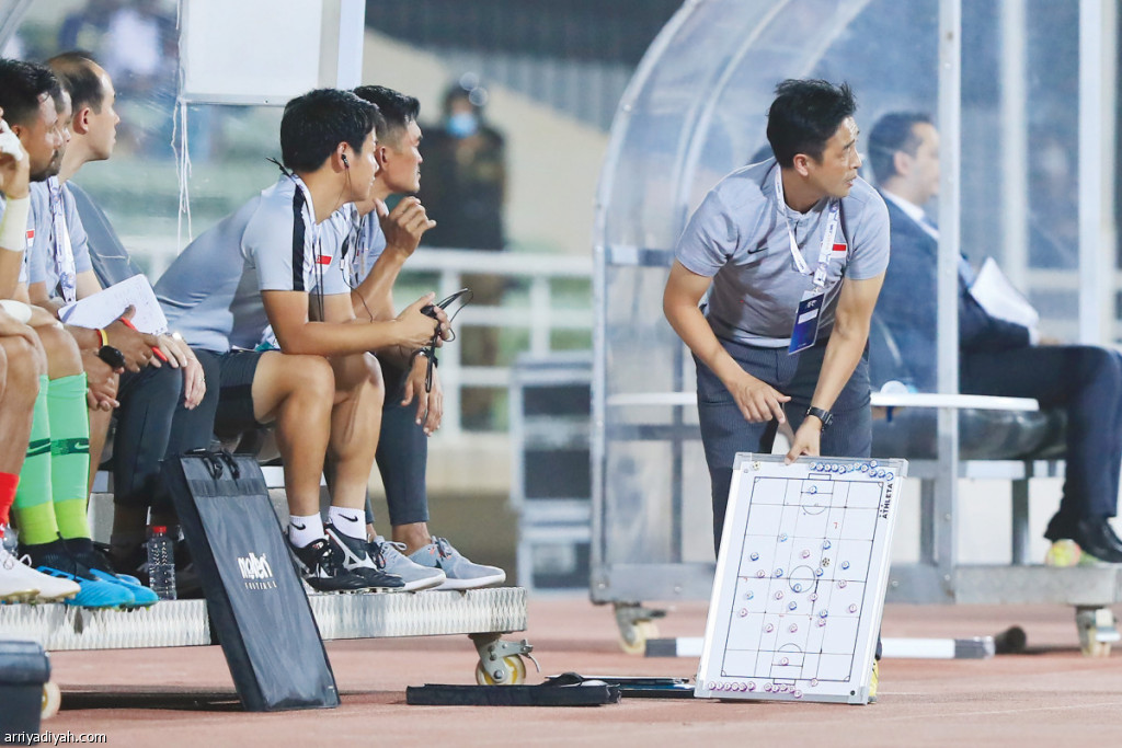 عاش الياباني تاتسوما يوشيدا مدرب سنغافورة تحت ضغط كبير بسبب الهجمات المتتالية للاعبي المنتخب السعودي.. وفي الصورة التي التقطت أمس المدرب الياباني يحمل السبورة الخاصة بالخطط الفنية وعينه على الملعب تراقب اللقاء تصوير: فهد الضويفري