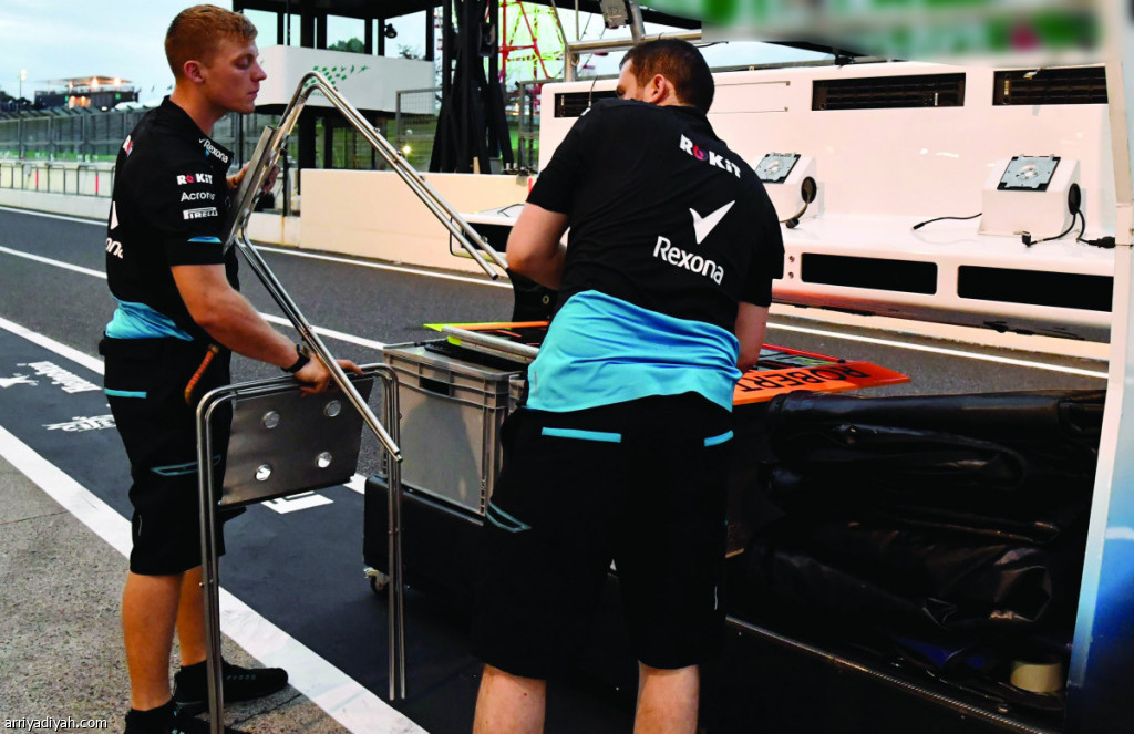 صورة التقطت أمس للطاقم الميكانيكي لفريق ويليامز يحملون أمتعتهم بعد إلغاء السباق بسبب إعصار هاجيبس (الفرنسية)