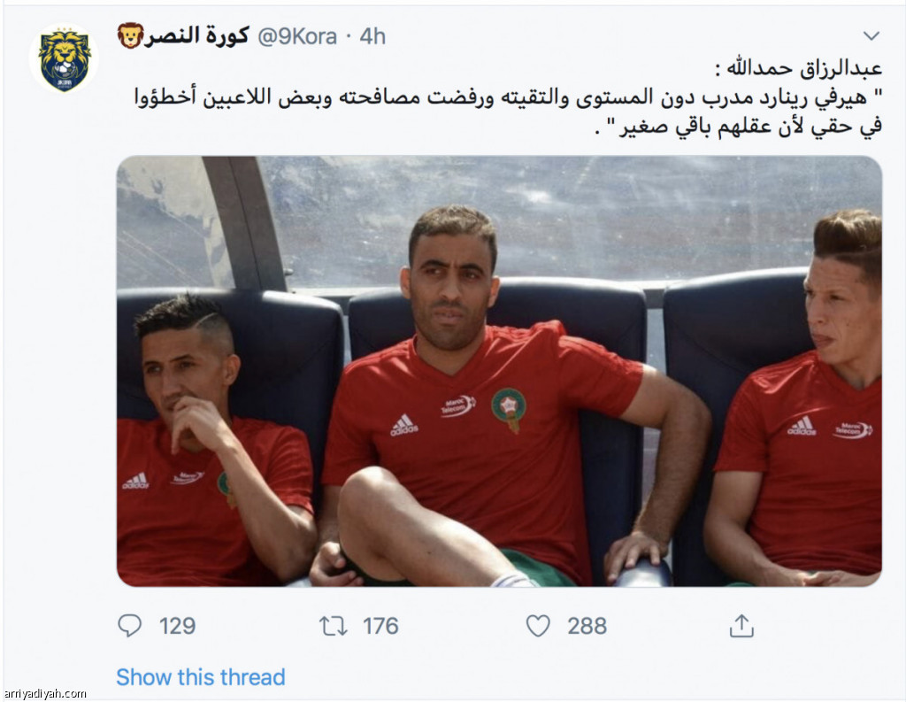 هاجم المغربي عبدالرزاق حمدالله مهاجم فريق النصر الأول لكرة القدم على حسابه في تويتر، الفرنسي هيرفي رينارد مدرب منتخب بلاده السابق والأخضر الحالي، وحمّل المغربي مسؤولية خروجه من المغرب خلال الأعوام الماضية المدرب الفرنسي بعد المشاكل الشخصية التي حدثت بينهم وعدم اقتناعه باللعب في الشرق الأوسط.