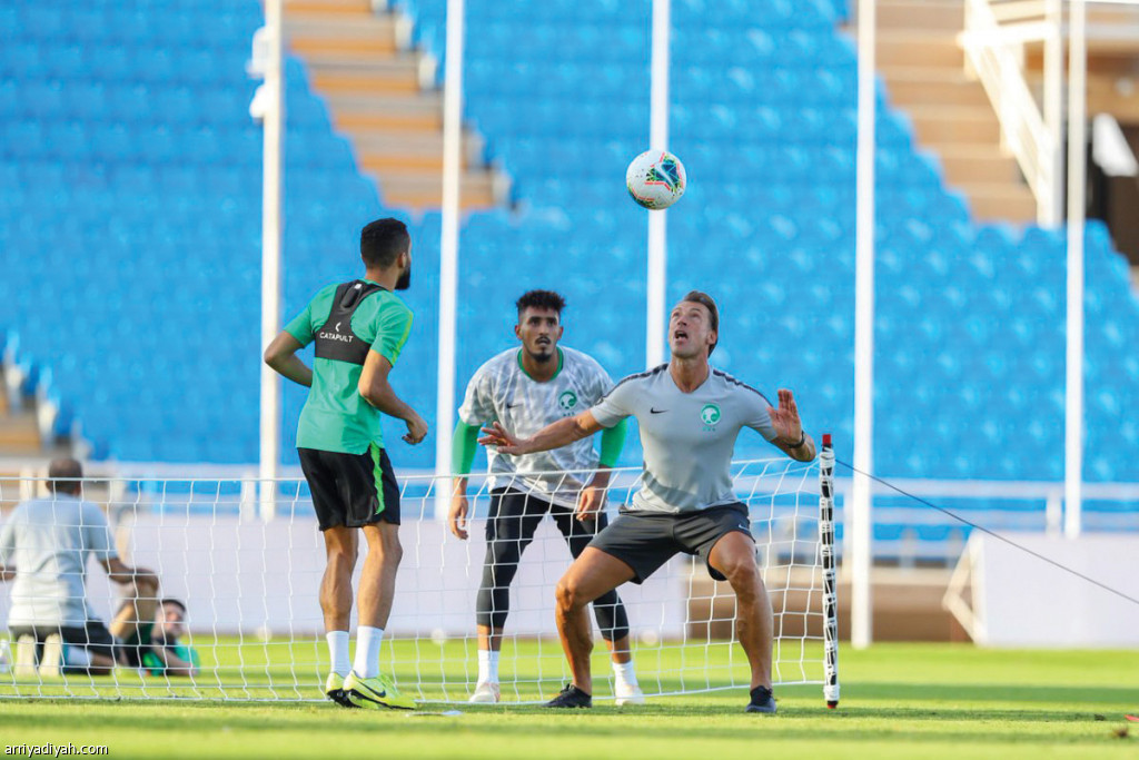 شارك الفرنسي هيرفي رينارد مدرب المنتخب السعودي الأول لكرة القدم في جزء من التدريبات.. وفي الصورة التي التقطت أمس المدرب الفرنسي يستعد لاستقبال الكرة برأسه أثناء المران الترفيهي الذي فرضه على اللاعبين