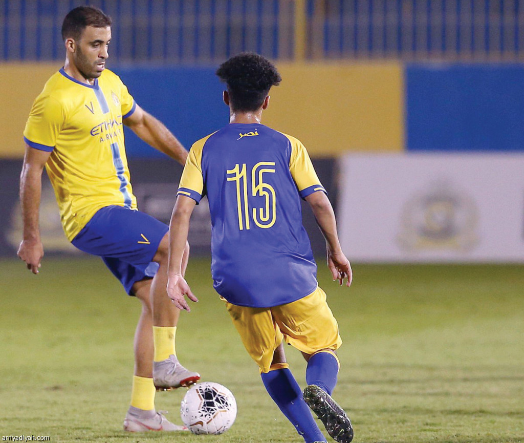 صورة التقطت أمس للمغربي عبد الرزاق حمد الله لاعب النصر يسيطر على الكرة محاولًا تجاوز أحد لاعبي فريق درجة الشباب في النادي (المركز الإعلامي ـ النصر)