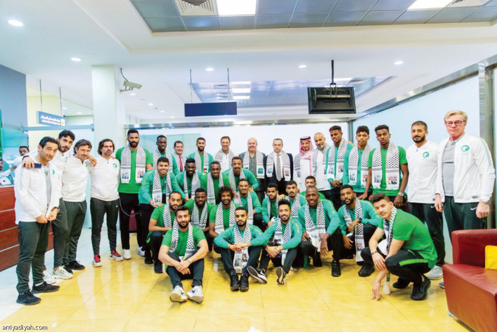 غادرت بعثة المنتخب السعودي الأول لكرة القدم إلى فلسطين عن طريق الأردن استعدادًا لخوض مواجهته أمام المنتخب الفلسطيني بعد غد ضمن الجولة الرابعة من التصفيات الآسيوية المؤهلة إلى نهائيات كأس العالم 2022 وكأس آسيا 2023.. وفي الصورة التي التقطت أمس باسم الآغا سفير فلسطين لدى السعودية مع لاعبي المنتخب الأخضر والجهازين الفني والإداري يتوشحون الشال الفلسطيني في مطار الأمير نايف بن عبد العزيز الدولي في القصيم استعدادًا للمغادرة إلى الأردن قبل التوجه إلى فلسطين (المركز الإعلامي ـ المنتخب السعودي)